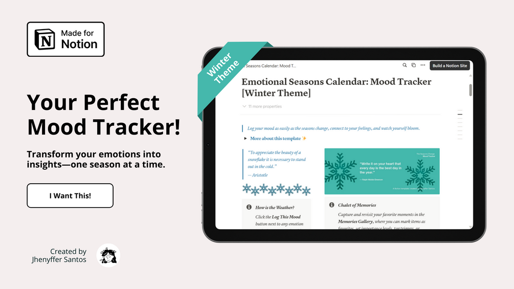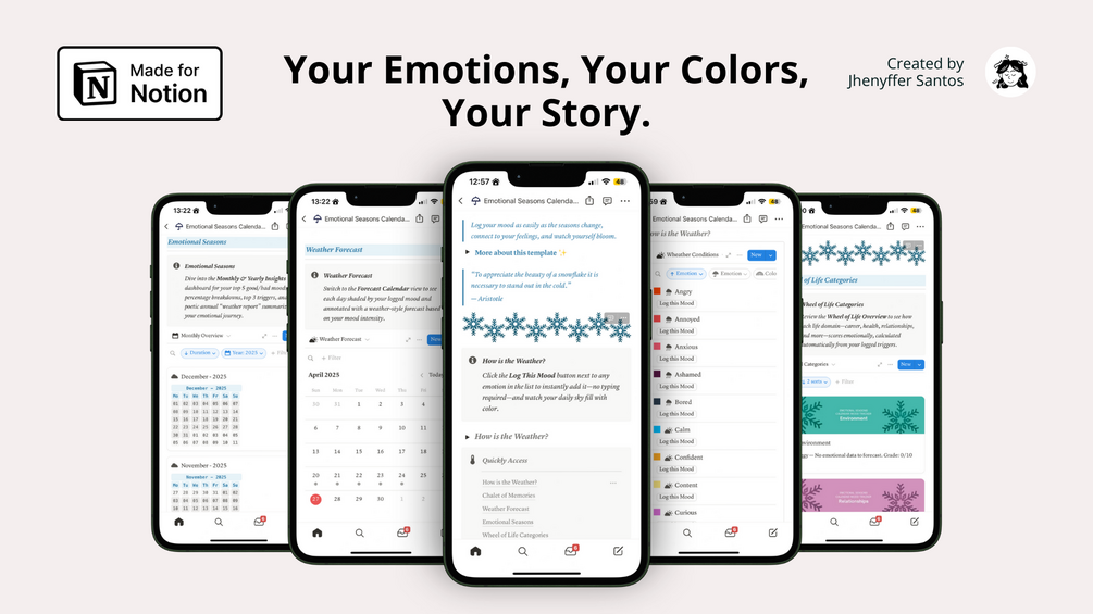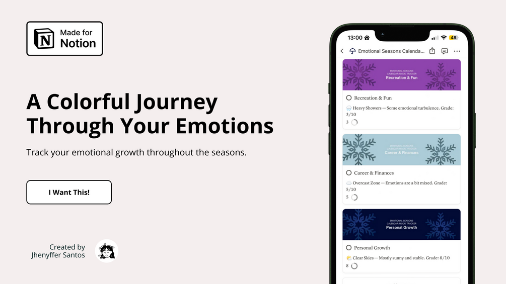 The Emotional Seasons Calendar: Mood Tracker is your all-in-one Notion template for effortless mood logging, personalized color visualization, cherished memory keeping, and powerful data-driven insights.